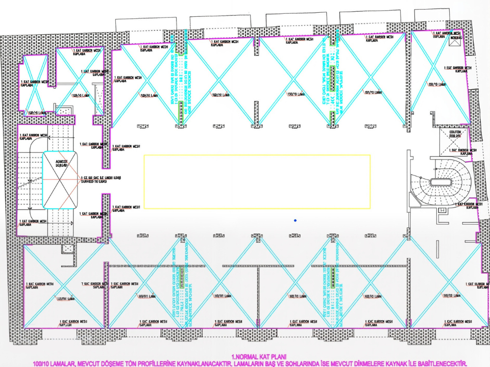 Karaköy Tütün Hanı Statik Güçlendirme Projesi, kültürel mirasın korunması ve yapısal güvenliğin sağlanması adına üstlendiğimiz kapsamlı bir çalışmadır. Bu tarihi yapıda, mevcut betonarme temel yapısı korunarak, depreme karşı dayanıklılığı artırmak amacıyla çelik taşıyıcı sistem ile güçlendirme imalatları gerçekleştirilmiştir. Proje ve uygulama sürecinde, taşıyıcı sistemin güçlendirilmesinde yüksek performanslı Karbon Mesh malzemeleri kullanılarak hem yapının yük taşıma kapasitesi artırılmış hem de tarihi dokuya minimum müdahale edilmiştir. Bu titiz mühendislik uygulaması, yapının gelecek nesillere güvenle aktarılmasını garantileyen uzmanlığımızı sergilemektedir.